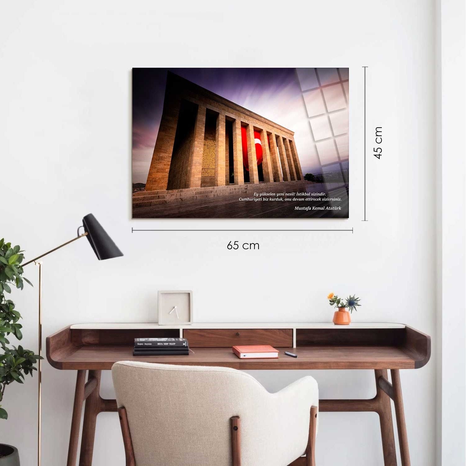 Gökyüzünün renk geçişleri ve bulutların hareketi, zamansız bir hikayenin, Türk ulusunun tarihine olan saygının görsel bir betimlemesi gibi. Anıtkabir'in bu cam tablo tasviri, Türkiye Cumhurbaşkanı ve Türkiye Cumhuriyeti’nin kurucusu Mustafa Kemal Atatürk’ün ebedi istirahatgahını, evinizin ya da ofisinizin duvarlarında anabilir ve onurlandırabilirsiniz.
