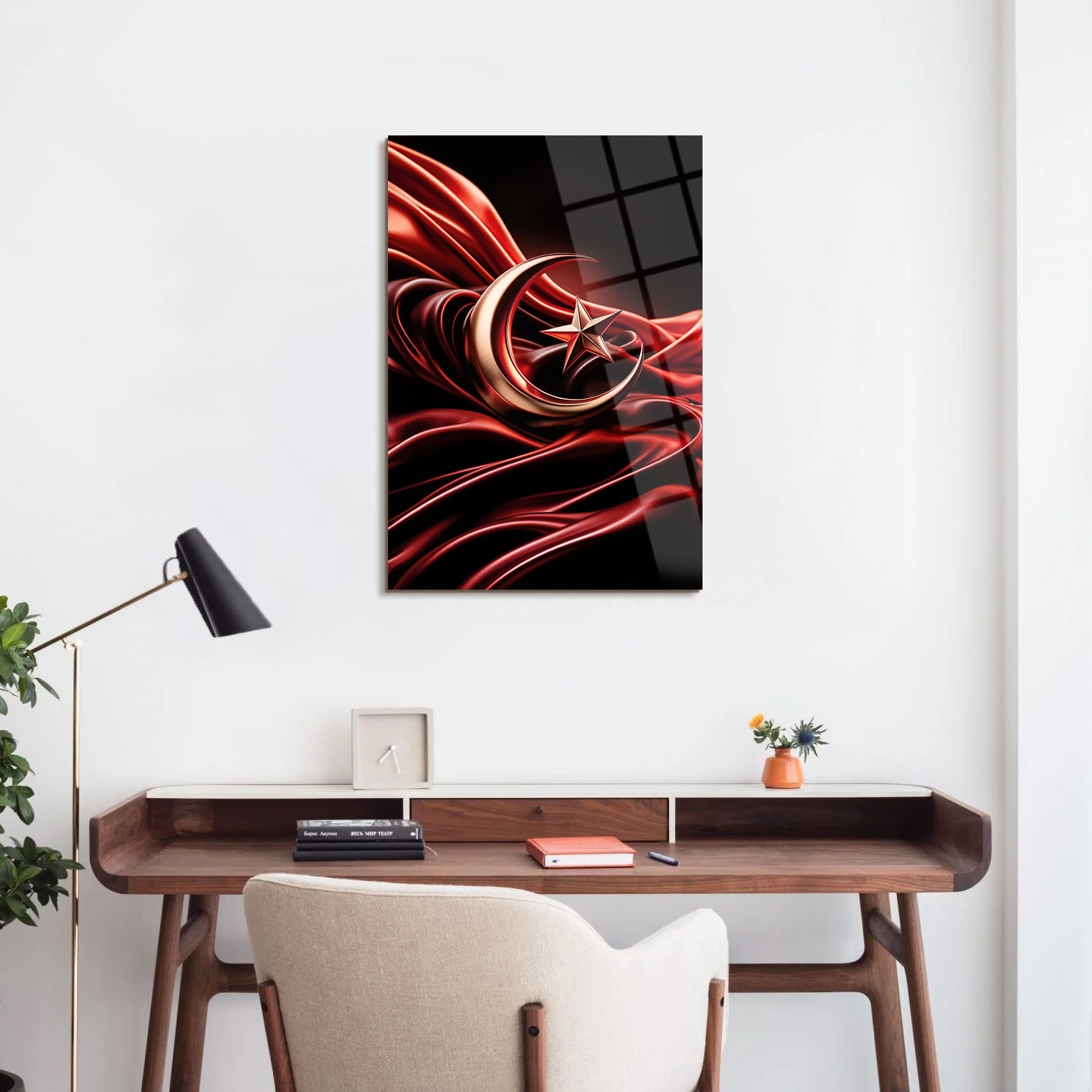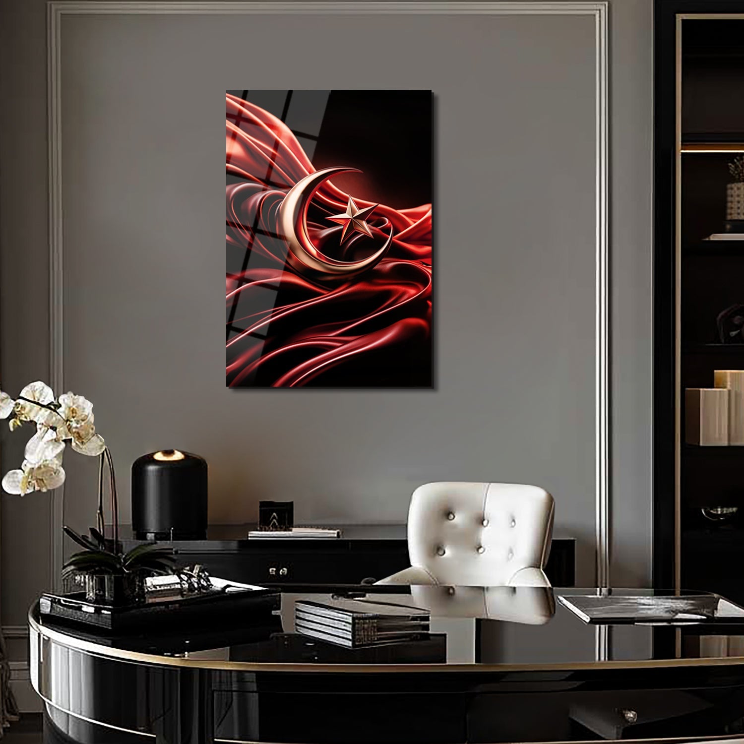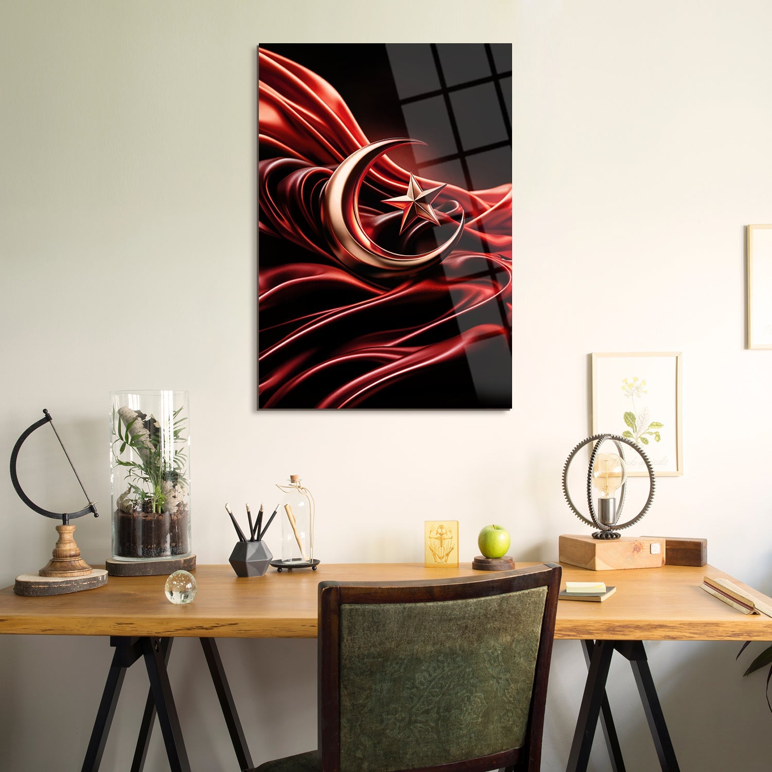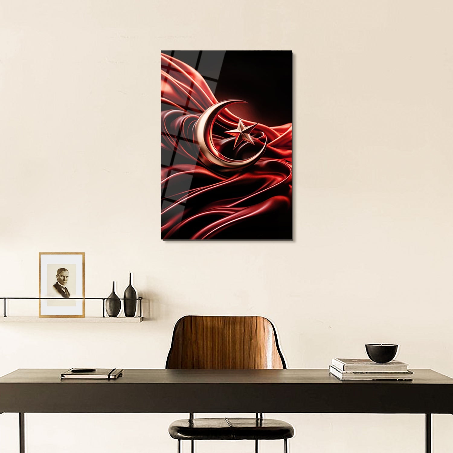 Kırmızı zemin üzerinde zarif bir şekilde tasarlanmış ay ve yıldızı taşıyan eşsiz bir sanat eseridir. Bu parça, bayrağımızın asaletini ve tarihini evinize getiriyor. Kırmızı ve altın renklerin muhteşem uyumu, her ortama görkemli bir dokunuş katıyor.