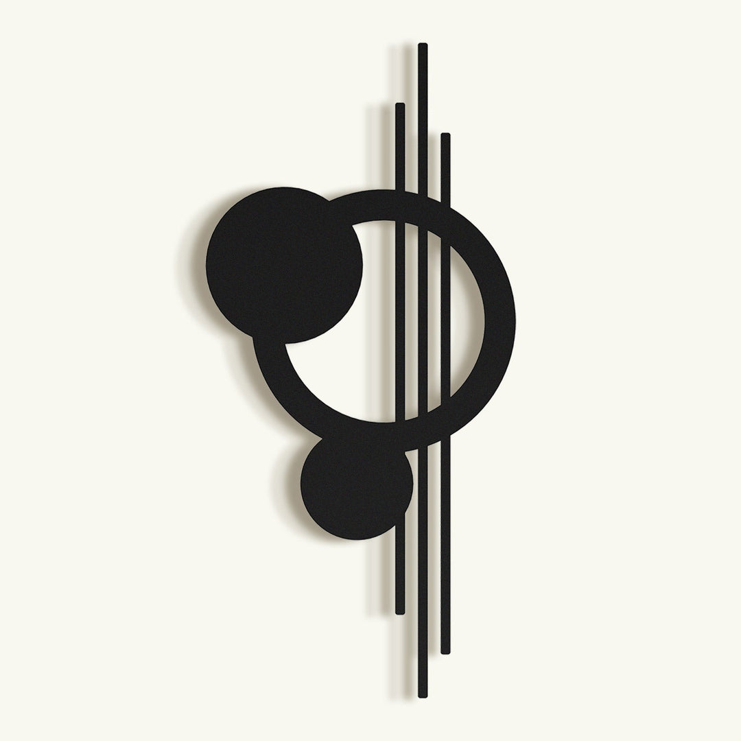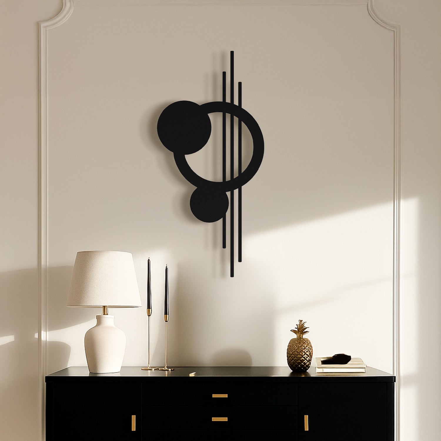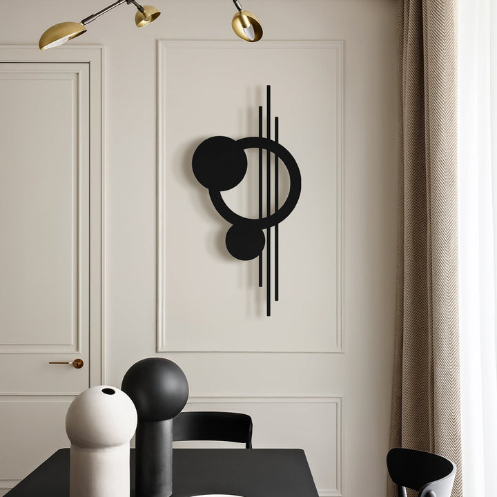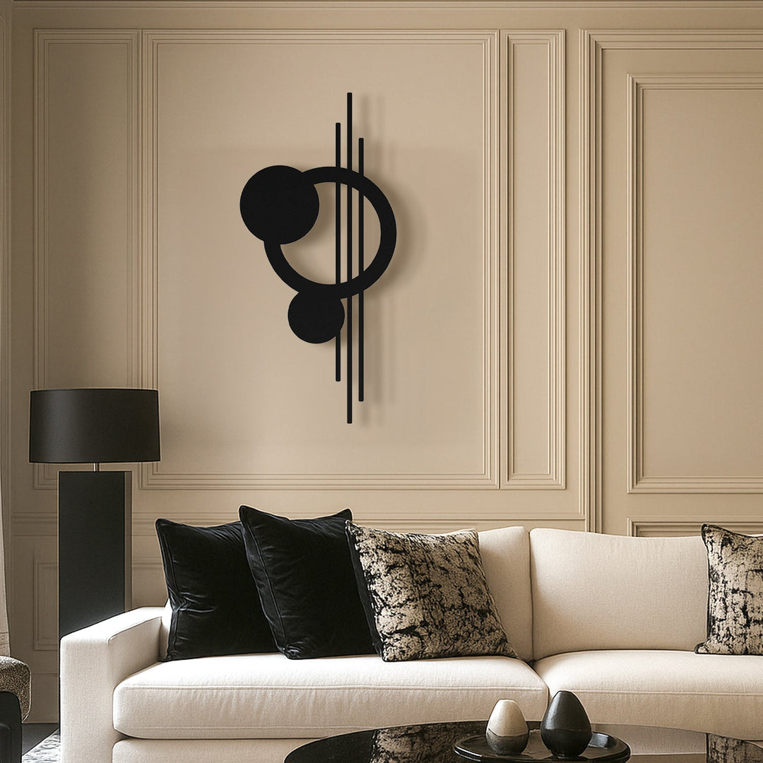 Shaped by the perfect harmony of timeless forms, this design reflects the flow of life through the order of lines and the inner balance symbolized by the softness of circles. The golden ring signifies a universal sense of unity, while the black geometric elements convey depth and mystery. With a minimalist yet strong presence, this piece brings a rhythm of modern elegance and tranquility to any space it occupies—a unique wall accent where calm meets style.