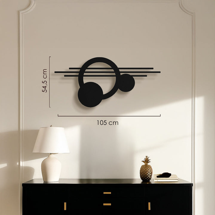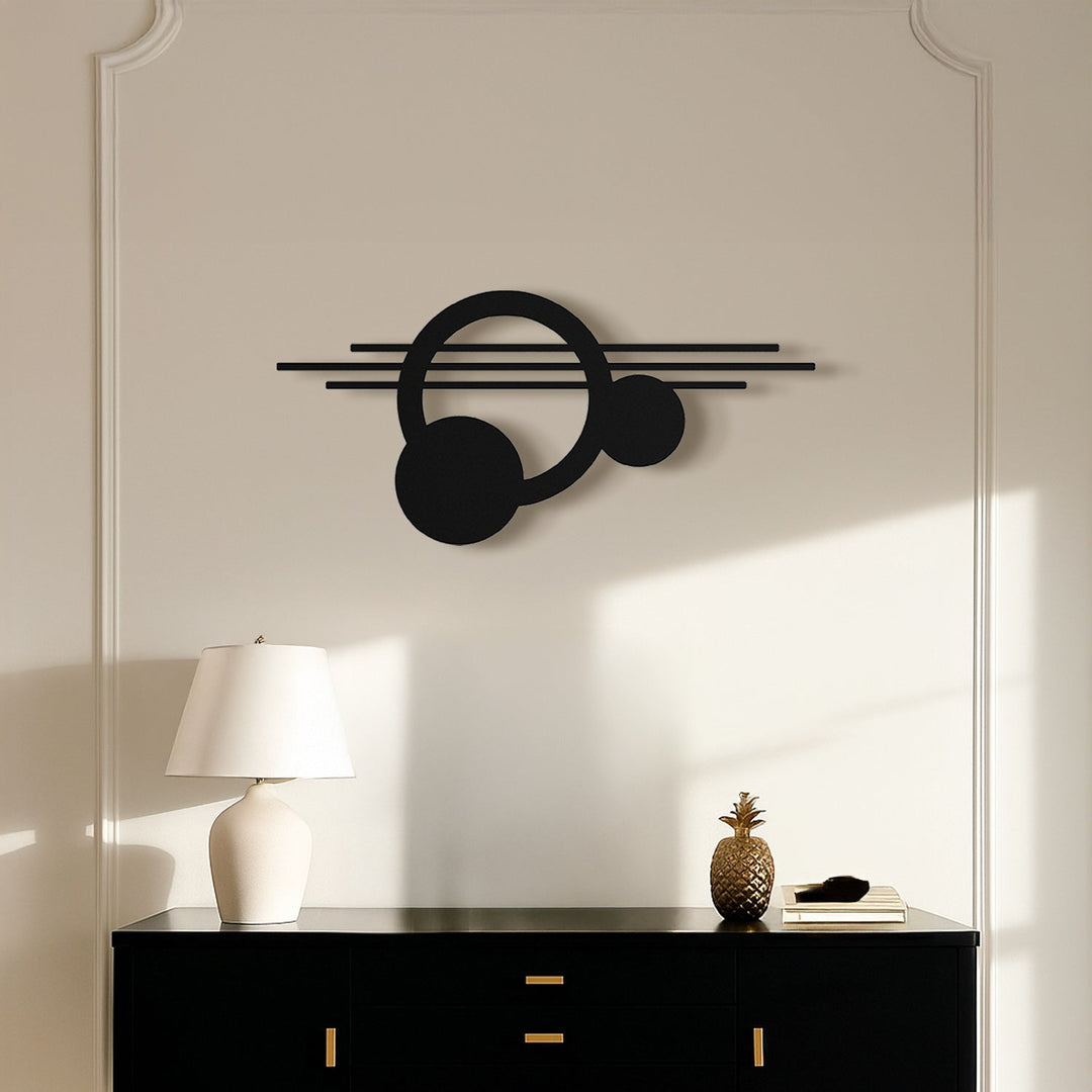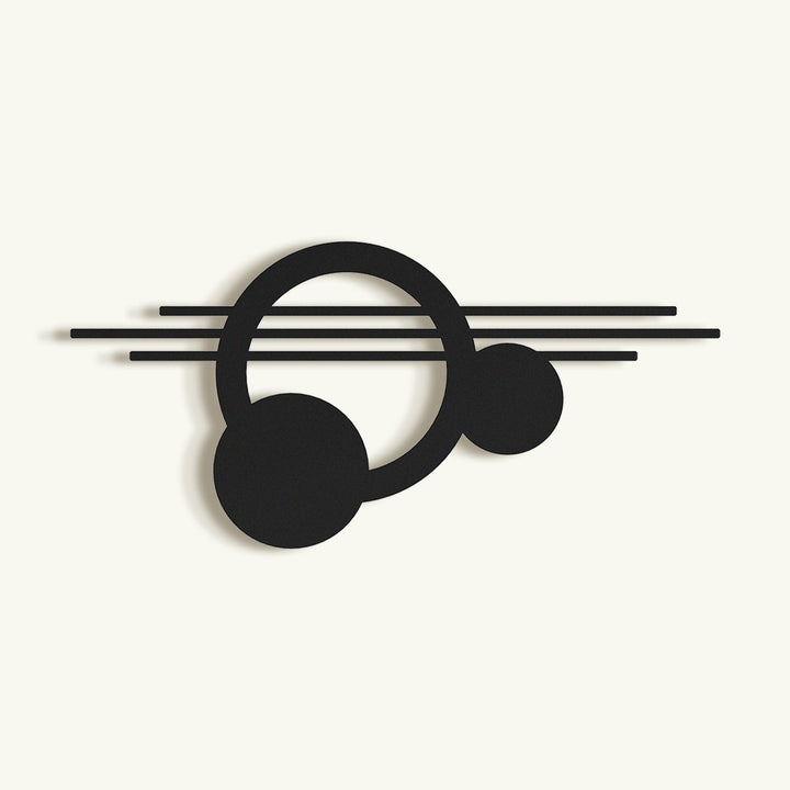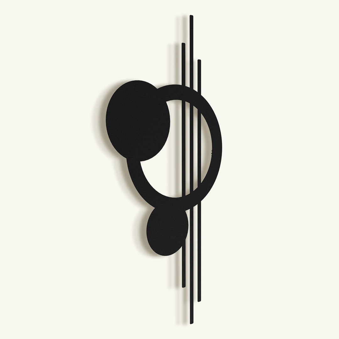 Shaped by the perfect harmony of timeless forms, this design reflects the flow of life through the order of lines and the inner balance symbolized by the softness of circles. The golden ring signifies a universal sense of unity, while the black geometric elements convey depth and mystery. With a minimalist yet strong presence, this piece brings a rhythm of modern elegance and tranquility to any space it occupies—a unique wall accent where calm meets style.