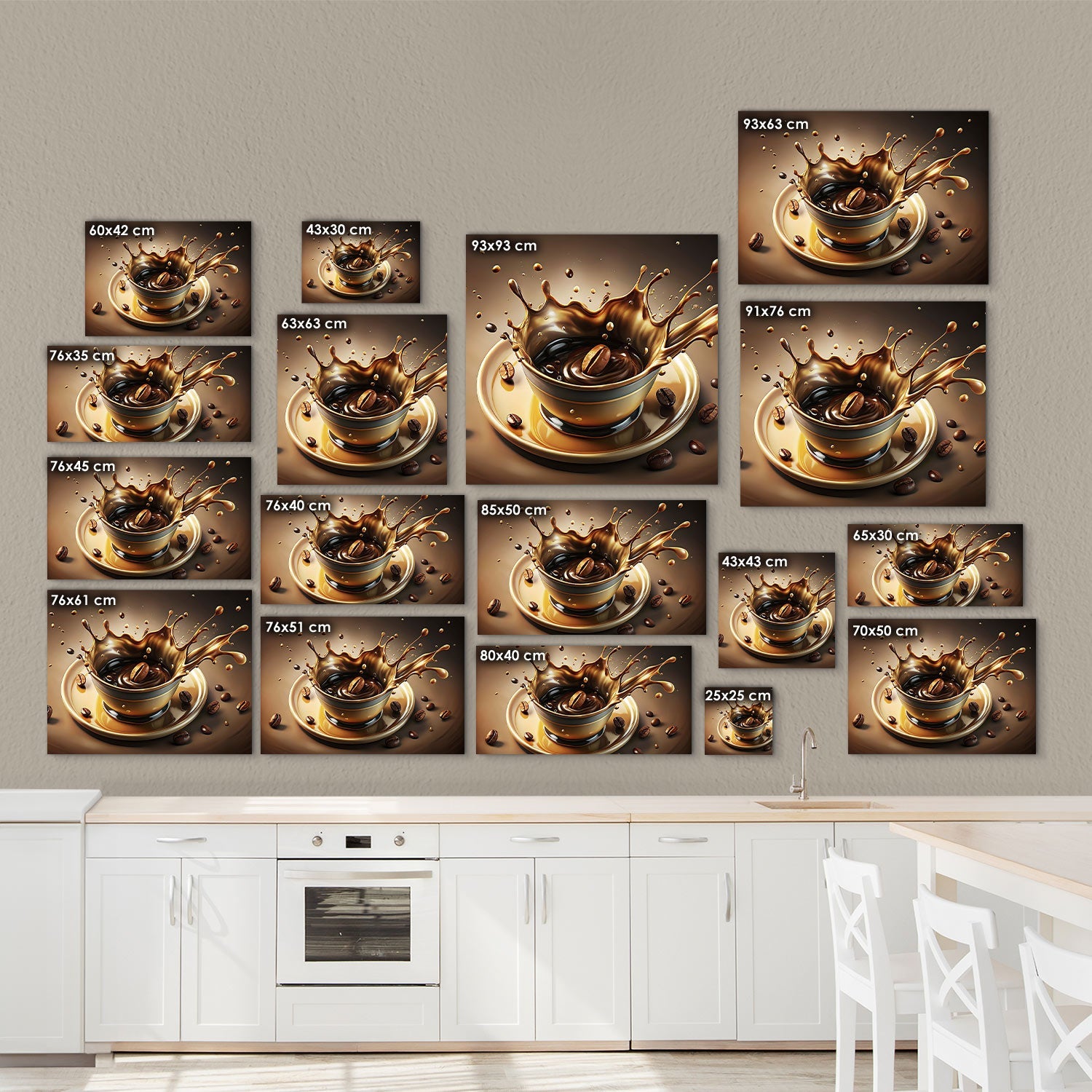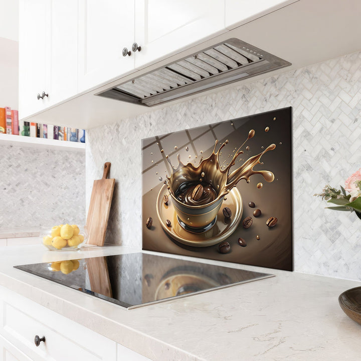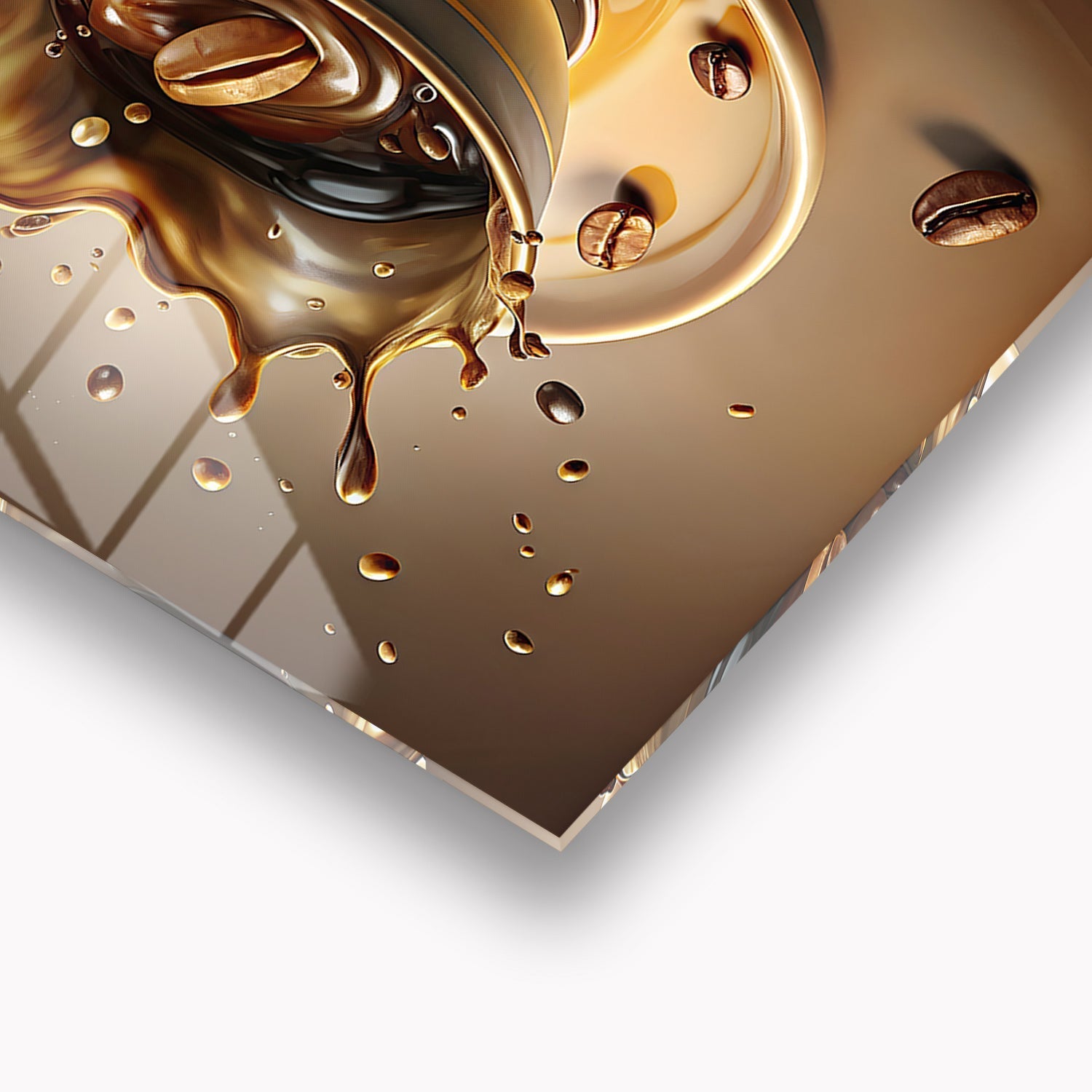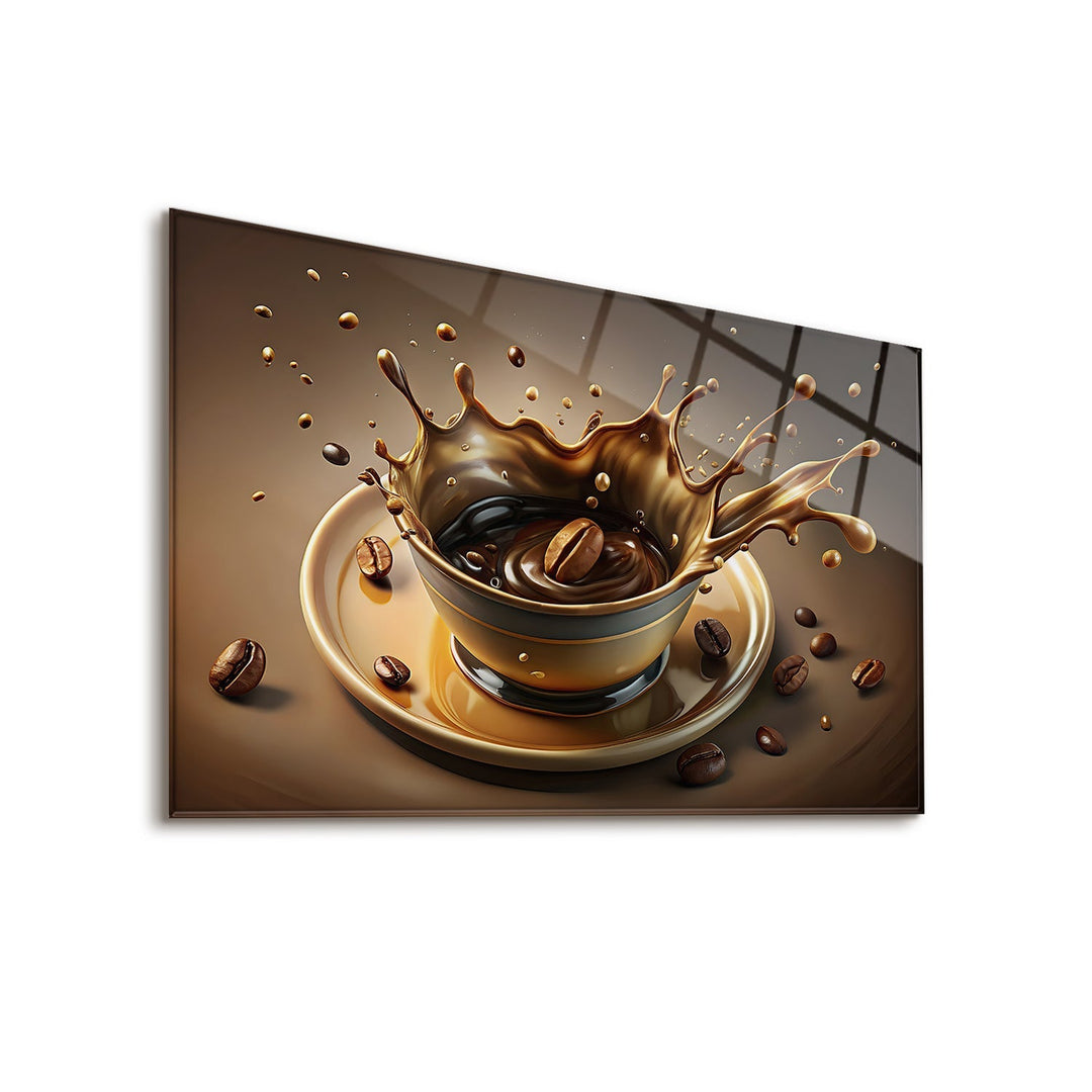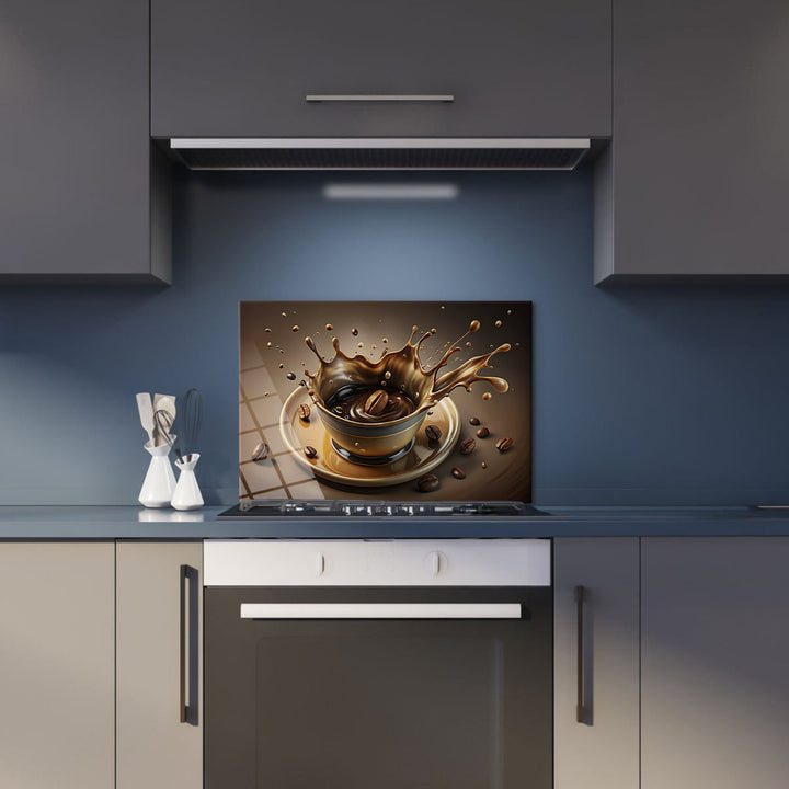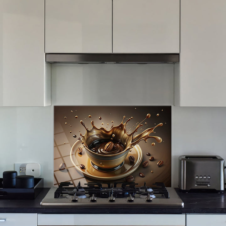 Splashing coffee droplets and flying beans capture the dynamic moment of a rich and vibrant cup of coffee, This visual feast dazzles with energy, inviting the viewer into your kitchen with the warm comfort of a sip,