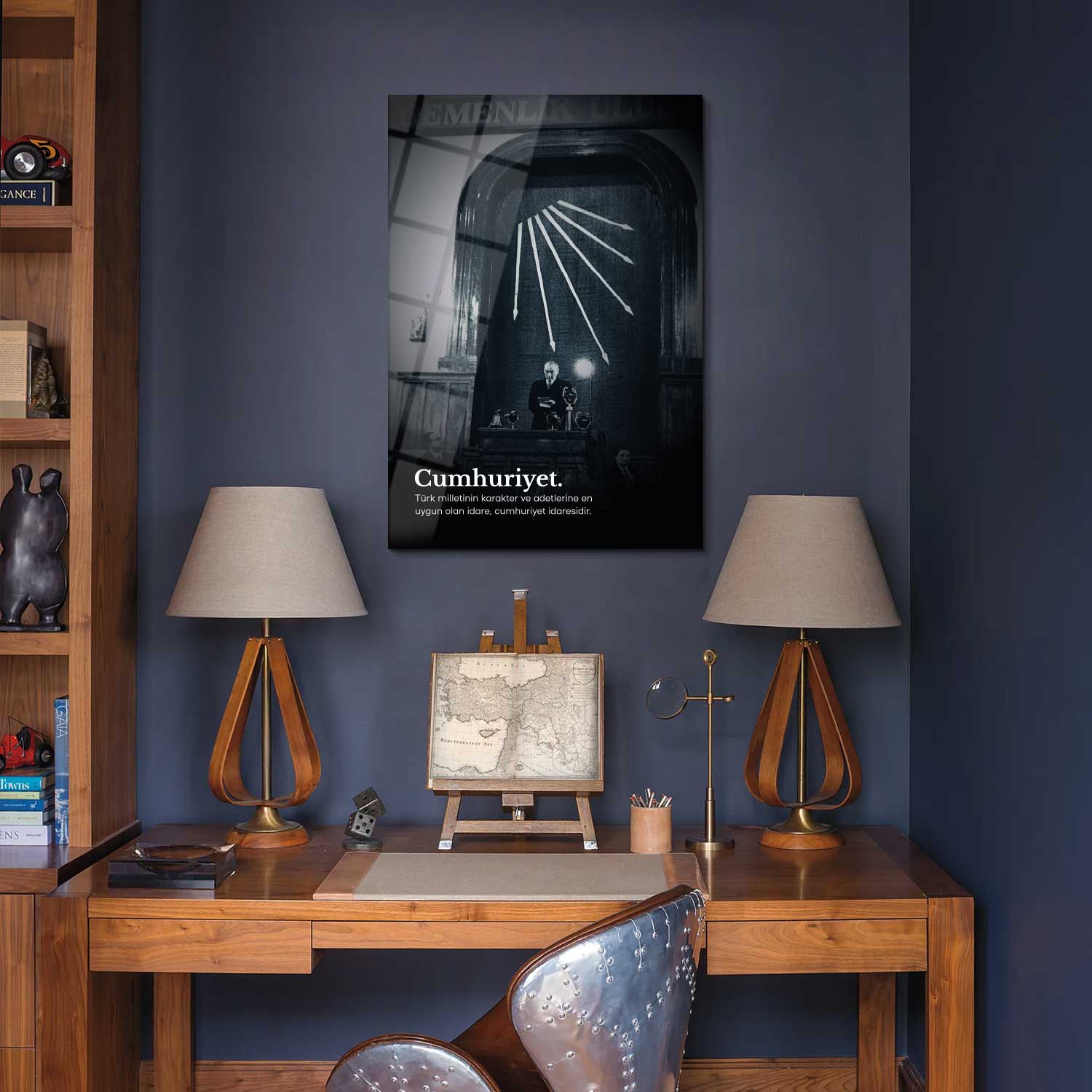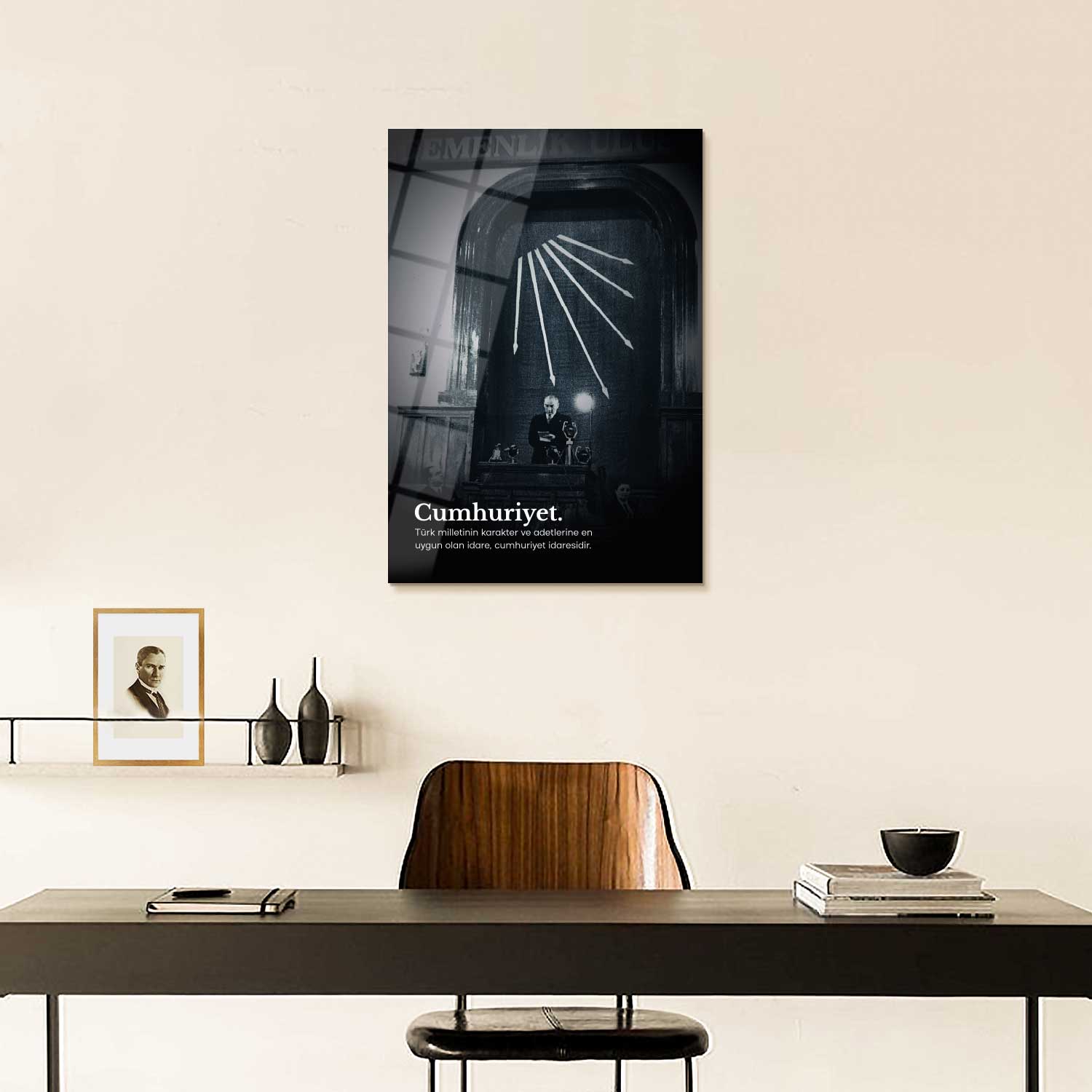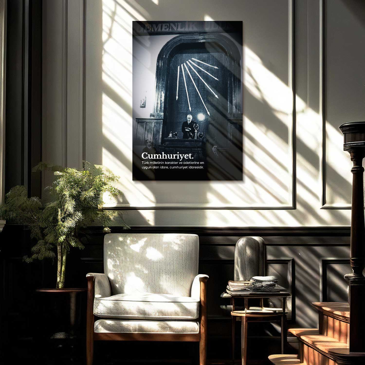 Evinizde ya da ofisinizde sergileyeceğiniz bu anlamlı parça, her baktığınızda Cumhuriyet'in değerlerini ve Atatürk'ün mirasını hatırlatacak, bu büyük devrimin gururunu ve coşkusunu yüreğinizde yeniden hissetmenizi sağlayacaktır. Cumhuriyet, Türk milletinin karakter ve adetlerine en uygun olan idaredir ve bu eser, bu gerçeği tüm ihtişamıyla yansıtmaktadır.