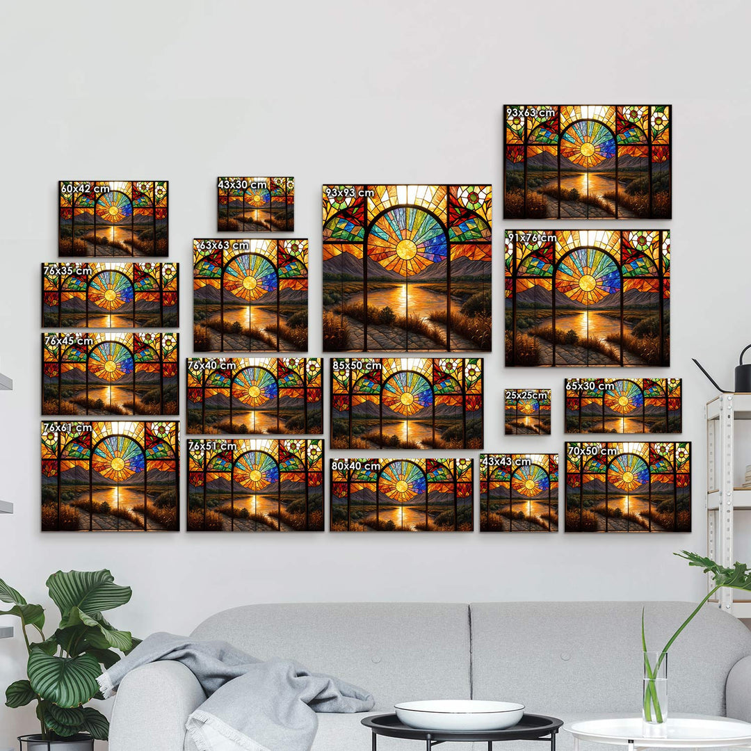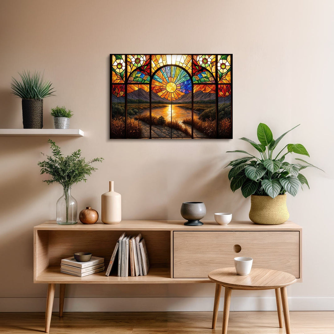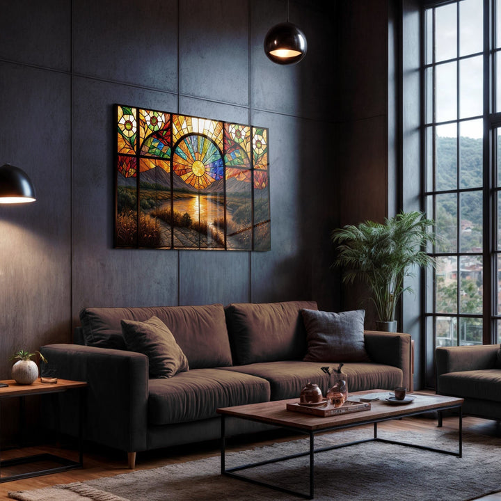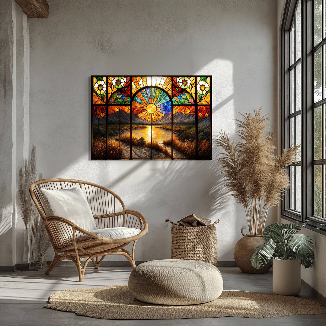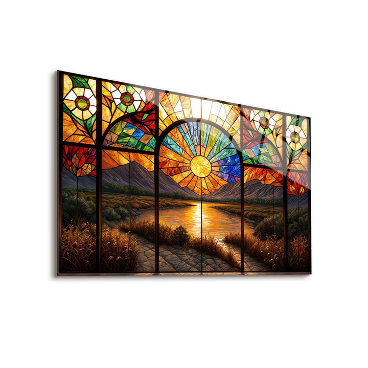 The warm tones of the setting sun rise behind the mountains, illuminating a radiant river, and casting a peaceful light through the stained glass windows, The mesmerizing details of the piece invite the viewer to embrace the serenity of nature,