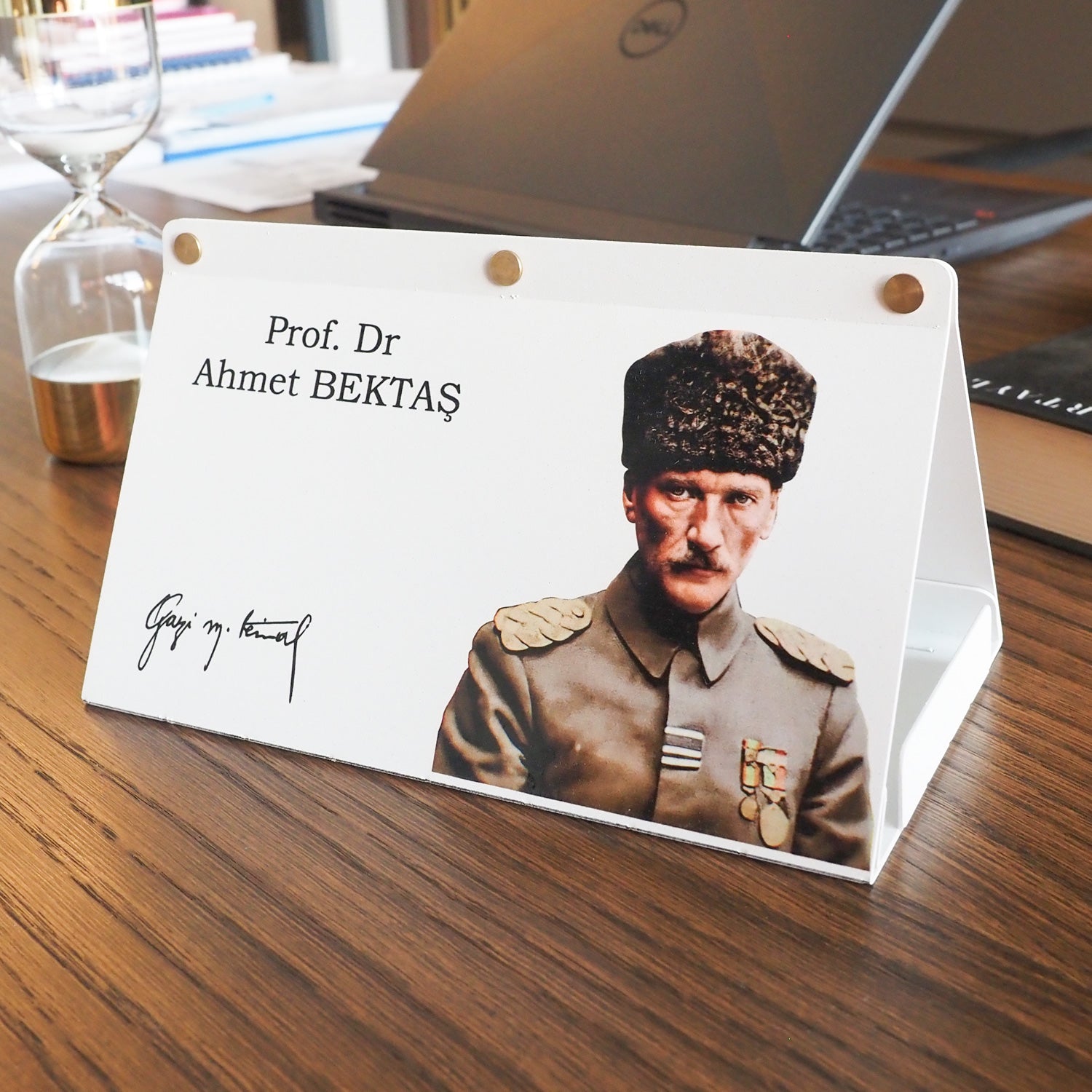 Kişiye Özel Metal Masa Takvimi ve Organizer, Atatürk’ün ilham verici duruşunu ve disiplinli yaşam tarzını çalışma alanlarınıza taşıyor. Hem tarih bilincini canlı tutan bir takvim hem de düzeni sağlayan bir organizatör olarak tasarlanan bu özel ürün, her detayında zamansız bir estetik sunuyor.