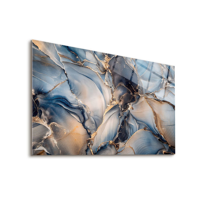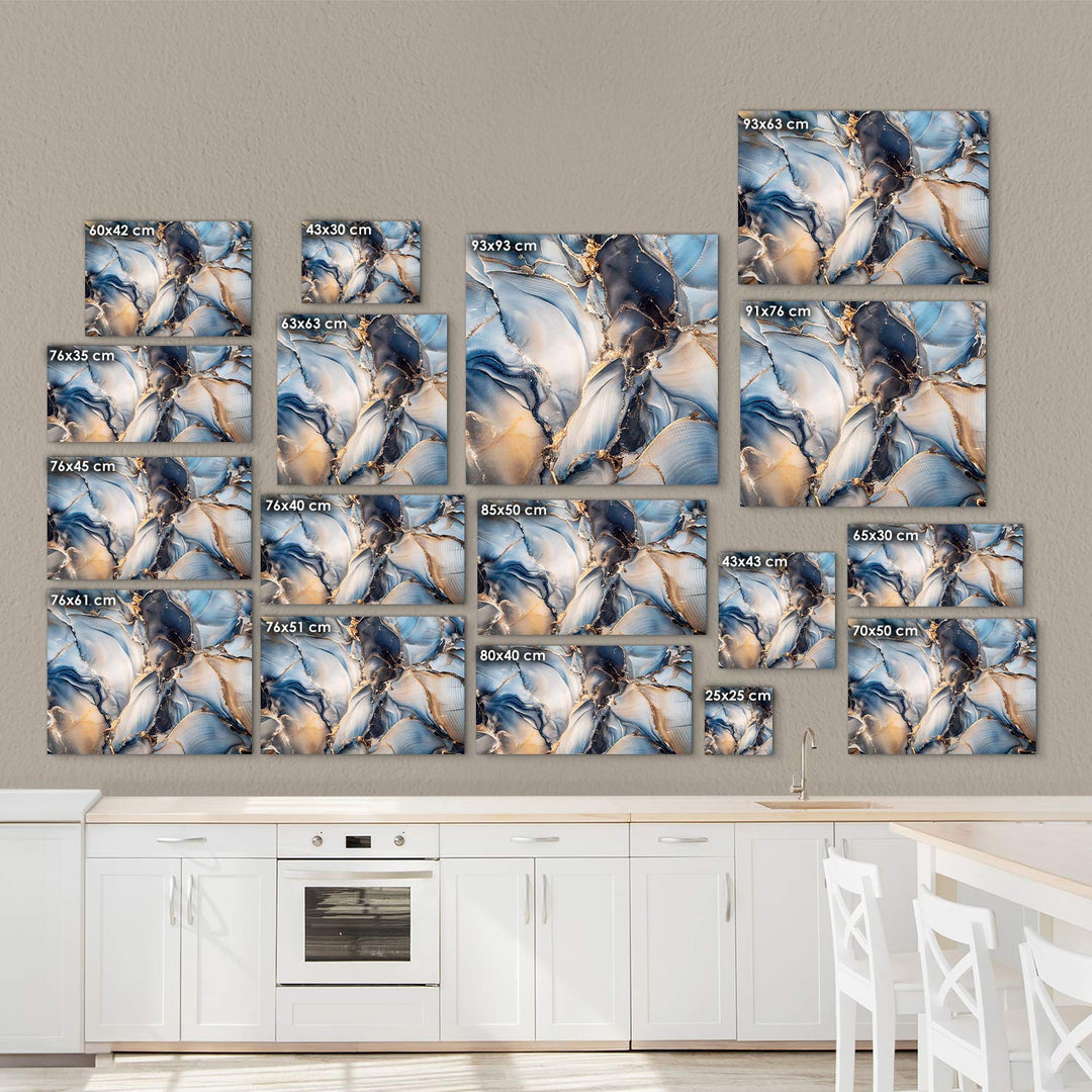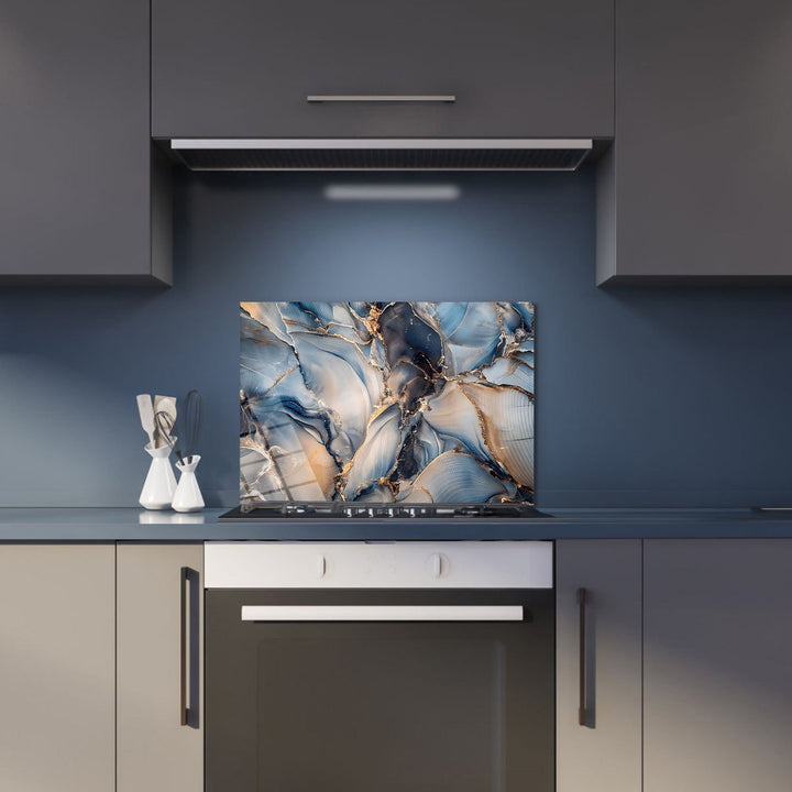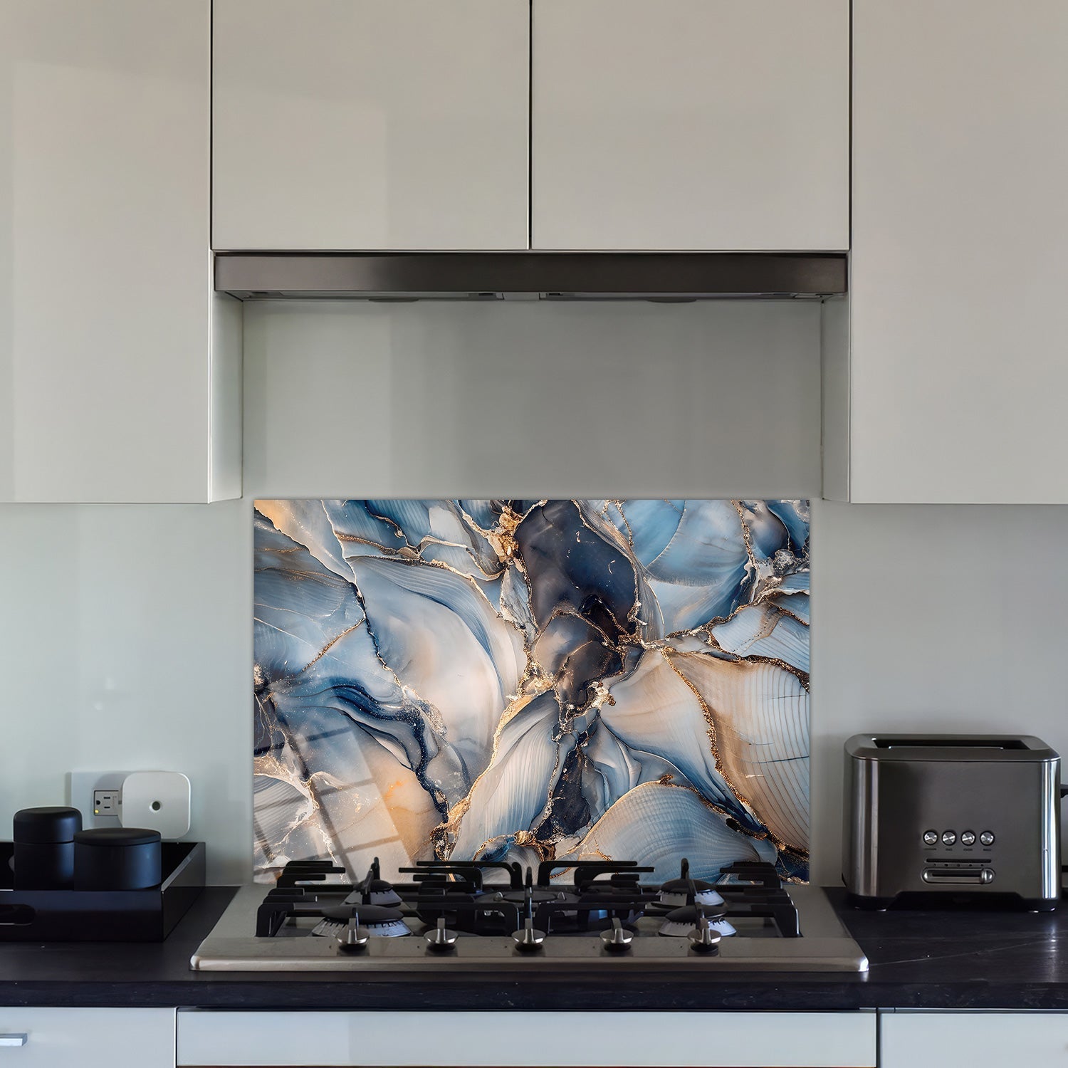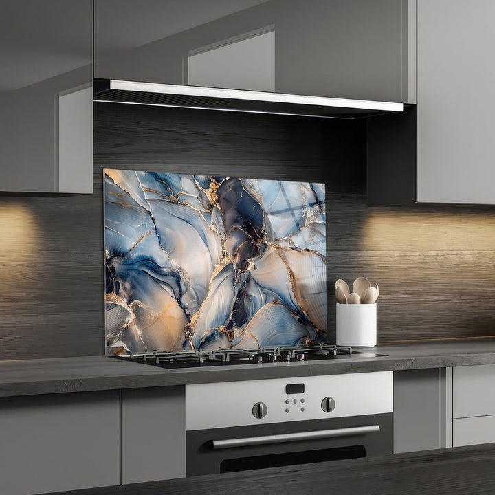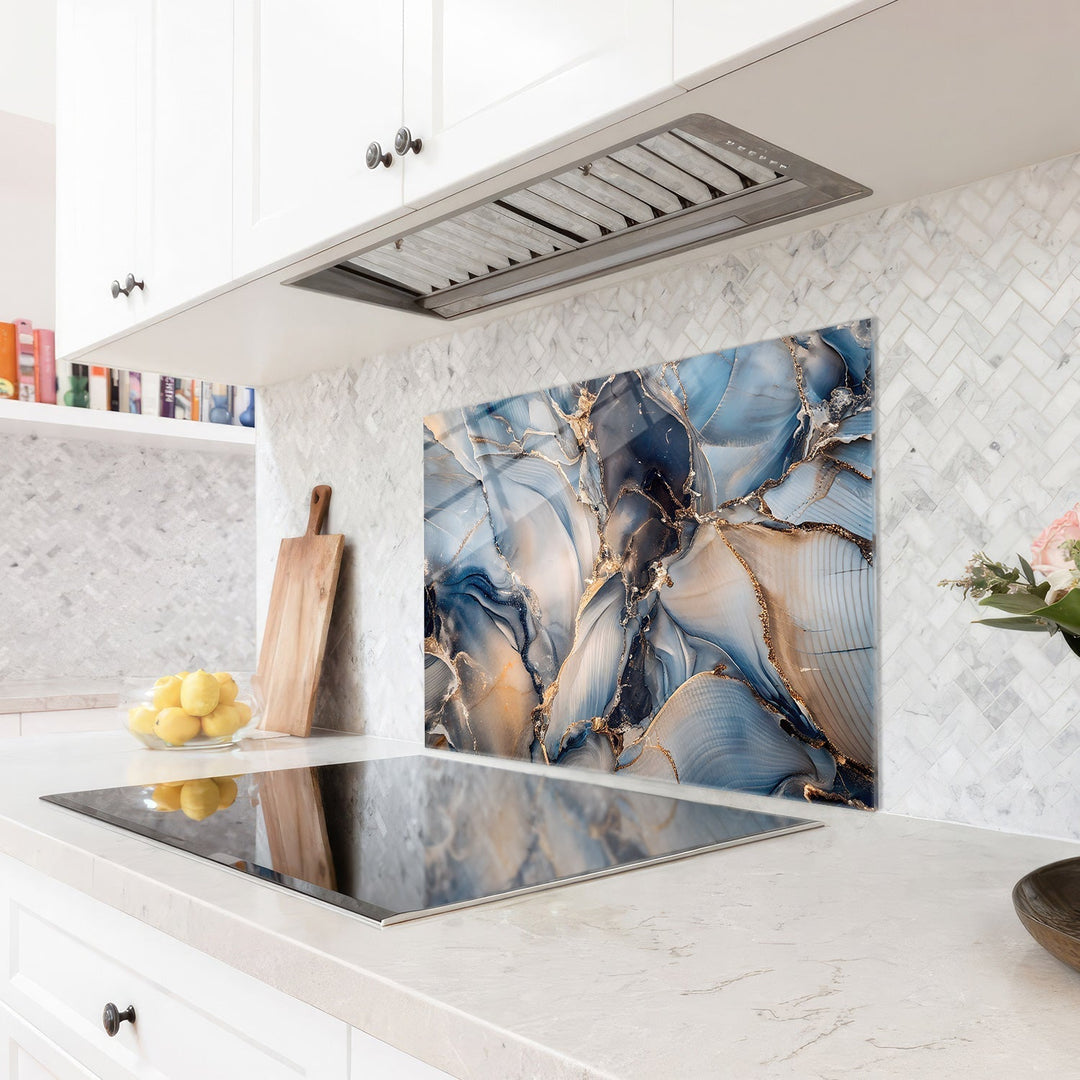 The depth of blue tones and the elegance of gold veins create a sophisticated atmosphere, Enhance your kitchen by presenting your meals in front of a unique piece of art,