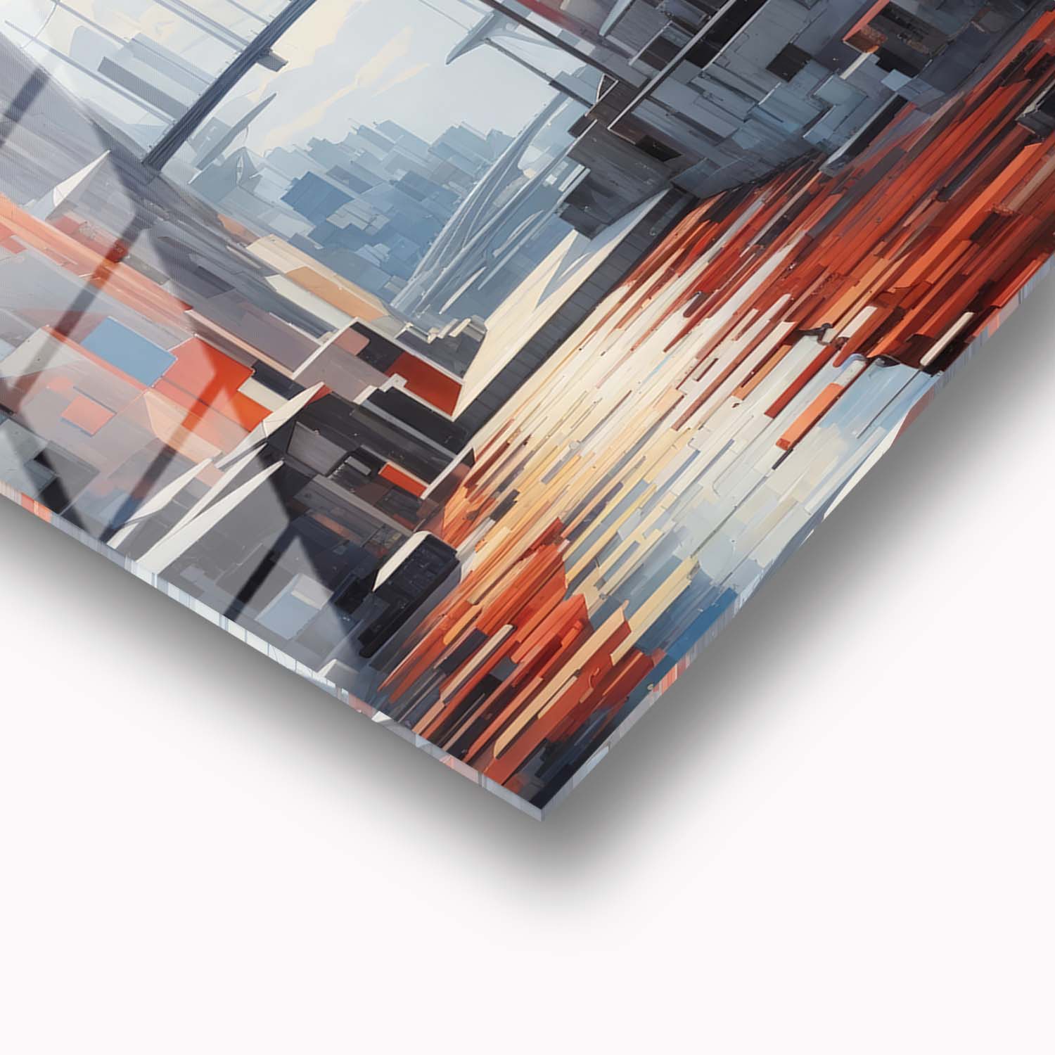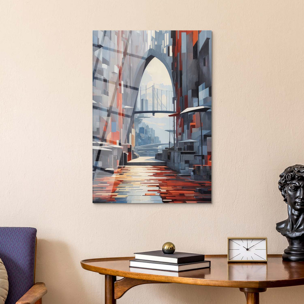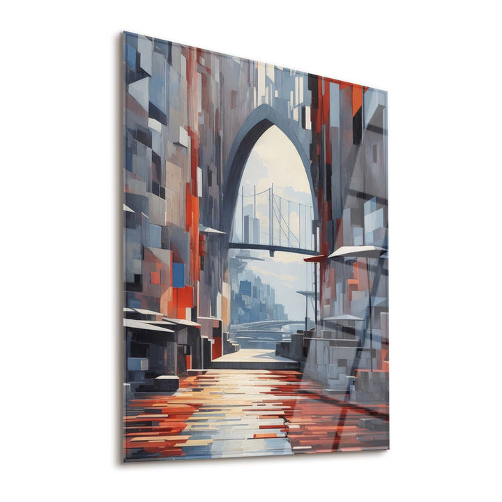 Moving along an urban waterway that reflects the texture of red and blue hues, capturing a geometric perspective game leading from a Gothic arch to a modern suspension bridge,