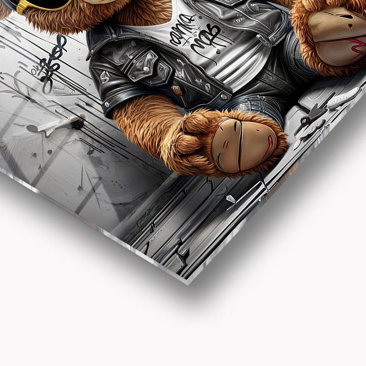 A plush bear sits in front of a wall, challenging the surrounding graffiti art with its leather jacket and sunglasses, This piece, adding a cool touch with its unique character and style, will bring a warm and cheerful reflection of modern art into your homes,